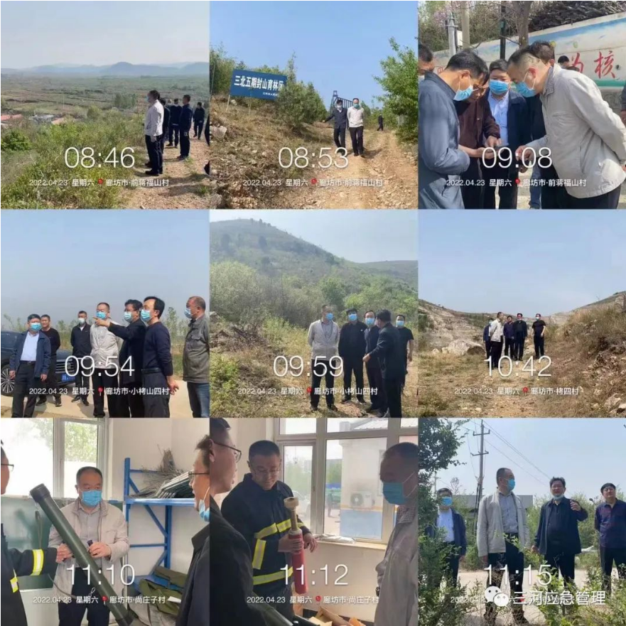 4月23日上午七点,三河市森防办主任、应急管理局党委书记、局长李杰督导检查森林防火工作,三河市段甲岭镇党委书记刘科、黄土庄镇人大主席张晓东,应急管理局、自然资源和规划局、供电公司等相关人员全程陪同检查。实地查看甘泉寺、下沟水库、前山村、防火通道等重点区域的地形地貌 、风险隐患点、供电设备等。共发现2处隐患,并要求相关部门立即整改。
