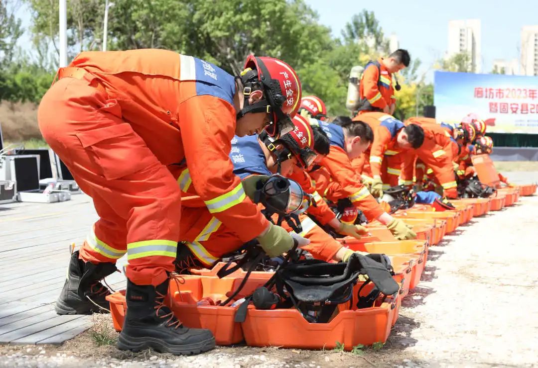5月23日,廊坊市2023年社会救援力量综合应急演练暨固安县2023防汛抢险应急演练举行。来自全市10余支社会救援队的300名成员进行了单兵技术展示、水上编队巡逻、翻舟自救、活饵救援、离心力救援、堤防加固、管涌抢护、燃气管道泄漏处置等救灾实兵演练。